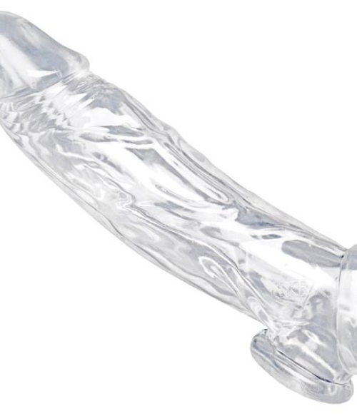 This veiny, lifelike penis enlarger offers instant results while remaining securely in place. It provides an instant boost to both girth and length, with a realistic textured outer sleeve that looks just like the real thing. The clear material allows you and your partner to see through to your excited shaft within. The firm, slickness inserts easily, while the devided shaft and ball chambers provide separation and security. Now you can enjoy enhanced performance and a tight fit, without any creams or schedules to follow. Just lube up and slip inside your new larger, harder, better cock! Measurements: 8 inches in length, 6.5 inches insertable, 1.75 inches in diameter.